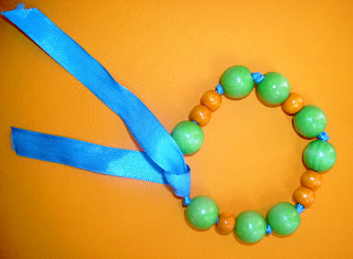 Pulseira com contas verdes (grandes) e laranjas com fita azul, 1.5contas.